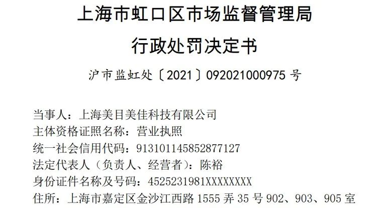 上海市虹口區(qū)市場(chǎng)監(jiān)督管理局行政處罰決定書顯示:2021年10月13日,我局執(zhí)法人員前往上海美目美佳科技有限公司位于上海市虹口區(qū)瑞虹路 181 號(hào)地下 1 層 LG-18 室的經(jīng)營(yíng)場(chǎng)所進(jìn)行檢查。該店主要售賣隱形眼鏡,其店堂內(nèi)懸掛的隱形眼鏡“早安系列”廣告,有“高分子材料 更薄、更透、更鎖色 高分子內(nèi)覆膜工藝”表述。隱形眼鏡屬于醫(yī)療器械。未在該廣告內(nèi)發(fā)現(xiàn)醫(yī)療器械廣告批準(zhǔn)文號(hào),以及“請(qǐng)仔細(xì)閱讀產(chǎn)品說明書或者在醫(yī)務(wù)人員的指導(dǎo)下購(gòu)買和使用”的內(nèi)容。現(xiàn)場(chǎng)當(dāng)事人亦無法提供該份隱形眼鏡廣告的醫(yī)療器械廣告審查批準(zhǔn)文號(hào)!