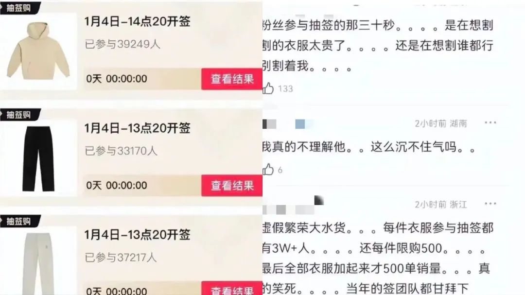 此外,王鶴棣的潮牌還引入了獨(dú)特的抽簽?zāi)J剑褐挥兄泻灢拍塬@得購(gòu)買資格。這也使得在小紅書、閑魚等第三方網(wǎng)絡(luò)平臺(tái),出現(xiàn)了一些中簽者高價(jià)轉(zhuǎn)讓衣服的情況。