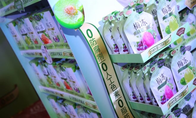 2019年,溜溜果園推出了“梅凍”,定位為果味+梅子味的袋裝擠食蒟蒻果凍,主打“0防腐劑”“0 人工色素”“0脂肪”。