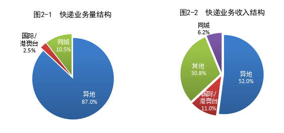 1月份,同城、異地、國際/港澳臺快遞業(yè)務(wù)量分別占全部快遞業(yè)務(wù)量的10.5%、87.0%和2.5%;業(yè)務(wù)收入分別占全部快遞收入的6.2%、52.0%和11.0%。與去年同期相比,同城快遞業(yè)務(wù)量的比重下降1.7個百分點,異地快遞業(yè)務(wù)量的比重增長1.0個百分點,國際/港澳臺業(yè)務(wù)量的比重增長0.7個百分點。
