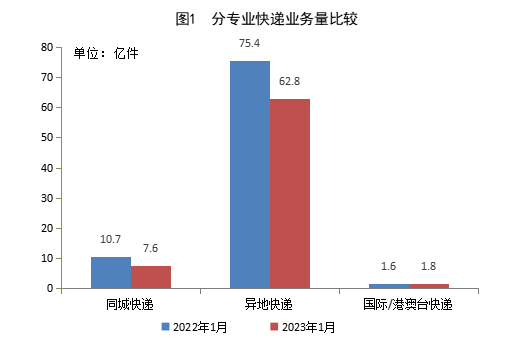 1月份,同城快遞業(yè)務(wù)量完成7.6億件,同比下降28.8%;異地業(yè)務(wù)量完成62.8億件,同比下降16.7%;國際/港澳臺業(yè)務(wù)量完成1.8億件,同比增長12.3%。