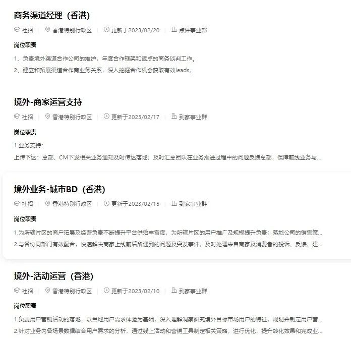 當時在美團美團官方招聘平臺上,已經(jīng)出現(xiàn)20個境外業(yè)務(wù)崗位,職位包括產(chǎn)品經(jīng)理、戰(zhàn)略分析、用戶運營、商業(yè)分析、客服負責人等,并均在工作地點一欄標注了香港,在招聘要求中注明“具有國際化從業(yè)經(jīng)驗者優(yōu)先”“粵語及英語可以作為工作語言者優(yōu)先”。