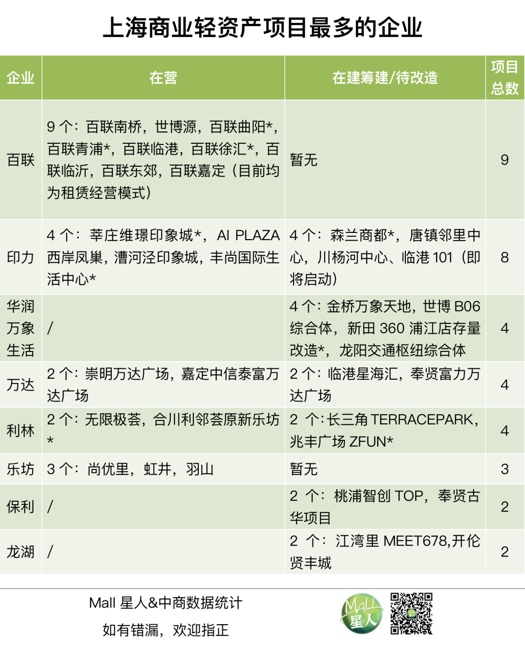 △注:*為存量改造項目。以上項目不含小股操盤項目(如印力旗下森蘭印象城)和<2萬㎡項目(例如樂坊旗下西南商城、國和1000、松匯、大華、新紫茂;利林旗下青浦中核合和里、浦東TOP芯聯)