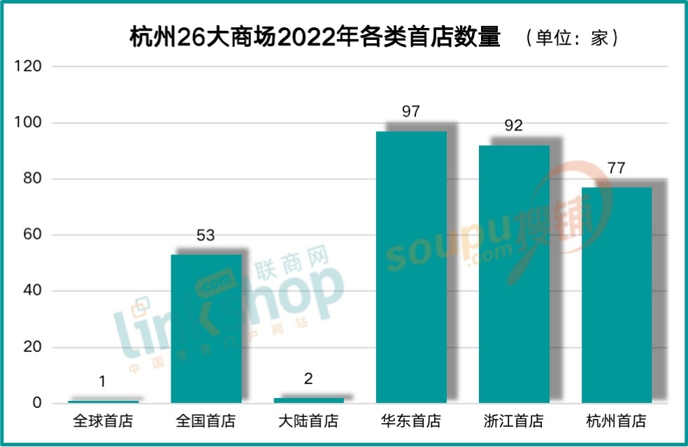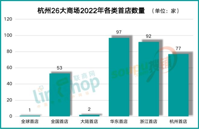 據(jù)聯(lián)商網(wǎng)零售研究中心不完全統(tǒng)計,2022年杭州26大商場共計引入各類首店322家,其中全球首店1家,全國首店53家,大陸首店2家,華東首店97家,浙江首店92家,杭州首店77家。