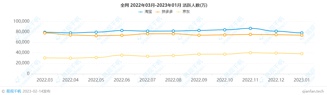 易觀千帆數(shù)據(jù)顯示,去年3月至今年1月期間,淘寶的月活均在7.8億以上,牢牢占據(jù)著月活冠軍的位置;緊隨淘寶之后的,則是月活大致維持在7.2億至7.8億區(qū)間的拼多多;與之對應(yīng)的是,京東的月活基本均在3億至4億的區(qū)間內(nèi)徘徊,在此期間京東只有去年11月的月活短暫地超過4億。