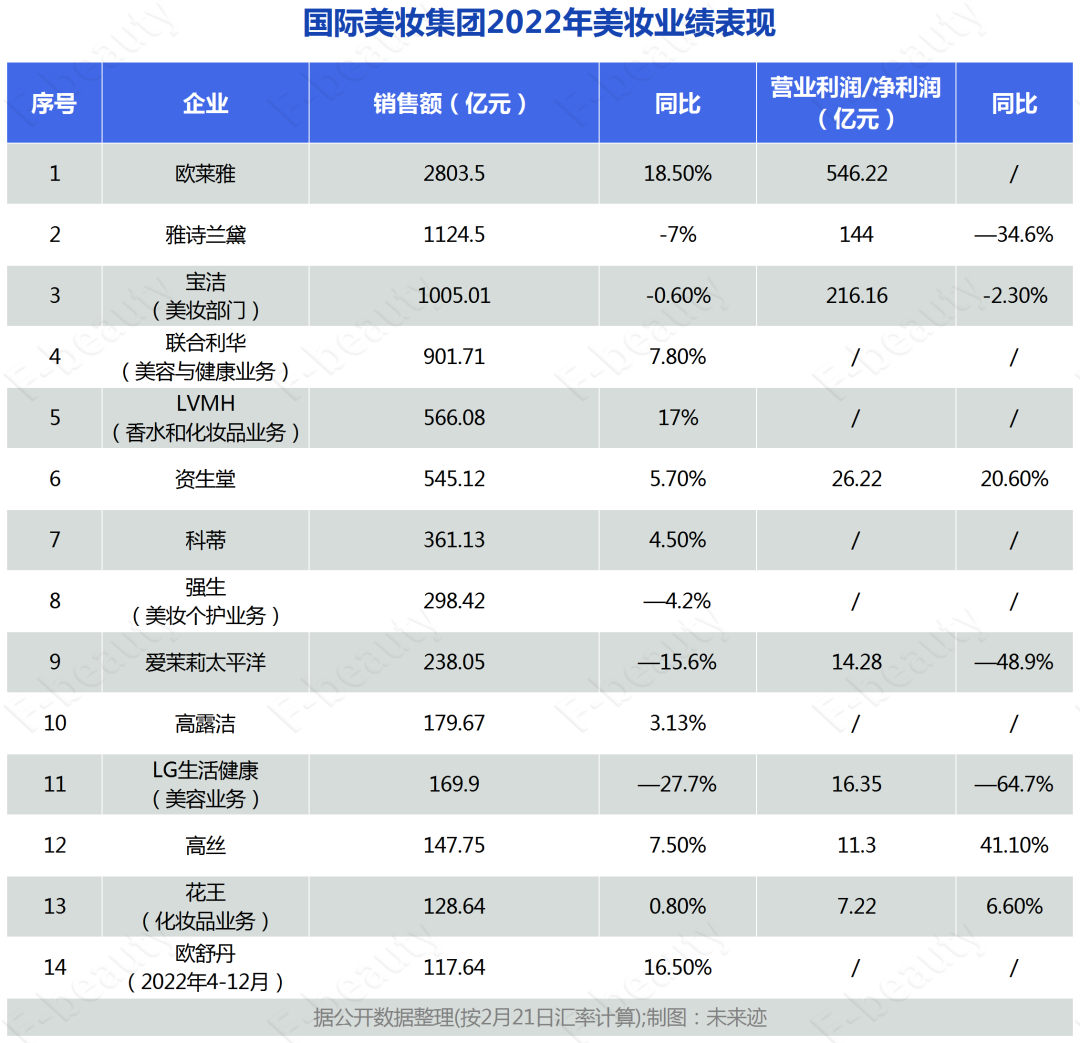 近期,歐萊雅、雅詩蘭黛、寶潔、資生堂等14家外資美妝集團(tuán)陸續(xù)發(fā)布了2022年業(yè)績報告,又一年的角逐落下帷幕。據(jù)《未來跡Future Beauty》統(tǒng)計,2022年全年,全球14大美妝集團(tuán)實(shí)現(xiàn)銷售額共計8587.12億元,數(shù)字背后反映的市場趨勢值得關(guān)注。