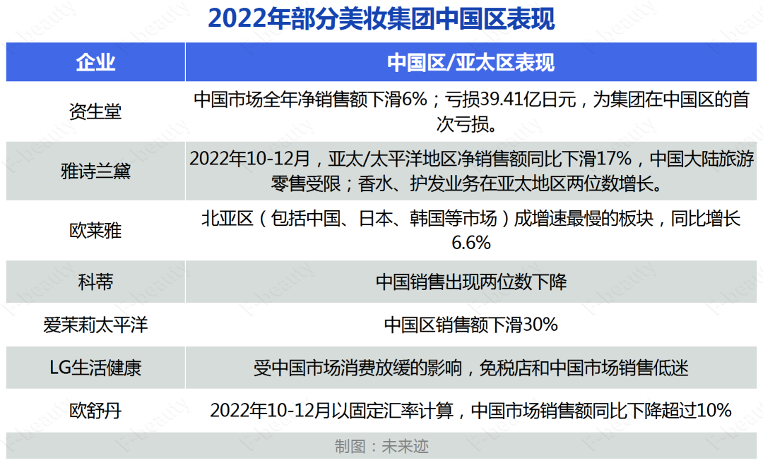 可以發(fā)現(xiàn),作為從前的“掘金寶地”,2022年大多數(shù)外資化妝品集團(tuán)卻在中國市場遭遇“滑鐵盧”。