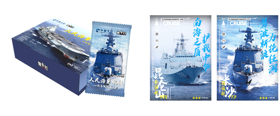 以集卡社推出的“人民海軍艦艇 傳奇版收藏卡”為例,該套卡按照球星卡工藝制作,采用直角厚卡的方式,每盒必定有一張有分量和質(zhì)感的金屬卡。產(chǎn)品收錄了我國(guó)建國(guó)以來(lái)的海軍軍艦,卡背則是該軍艦的科普知識(shí)以及歷史介紹,兼具收藏性和科普性。在2022年國(guó)慶期間一經(jīng)推出,銷(xiāo)售火爆,一盒難求。