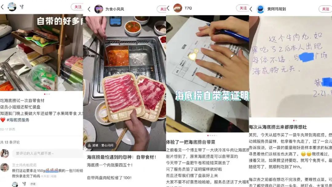 但也有不同的聲音:“不讓自帶那誰還愿意去海底撈啊”、“菜品量少還貴,就算兩個人自己帶肉去也要吃個兩三百”。