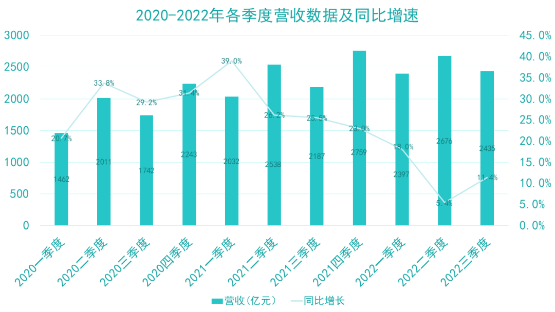 2022年11月,京東發(fā)布第三季度財報,凈收入2435億元,同比增長11.4%。其中,凈服務(wù)收入為465億元,同比增長42.2%,占凈收入的比例達到19.1%;商品收入為1970億元,同比增長5.9%;歸屬于普通股股東的凈利潤為60億元,去年同期凈虧損28億元。