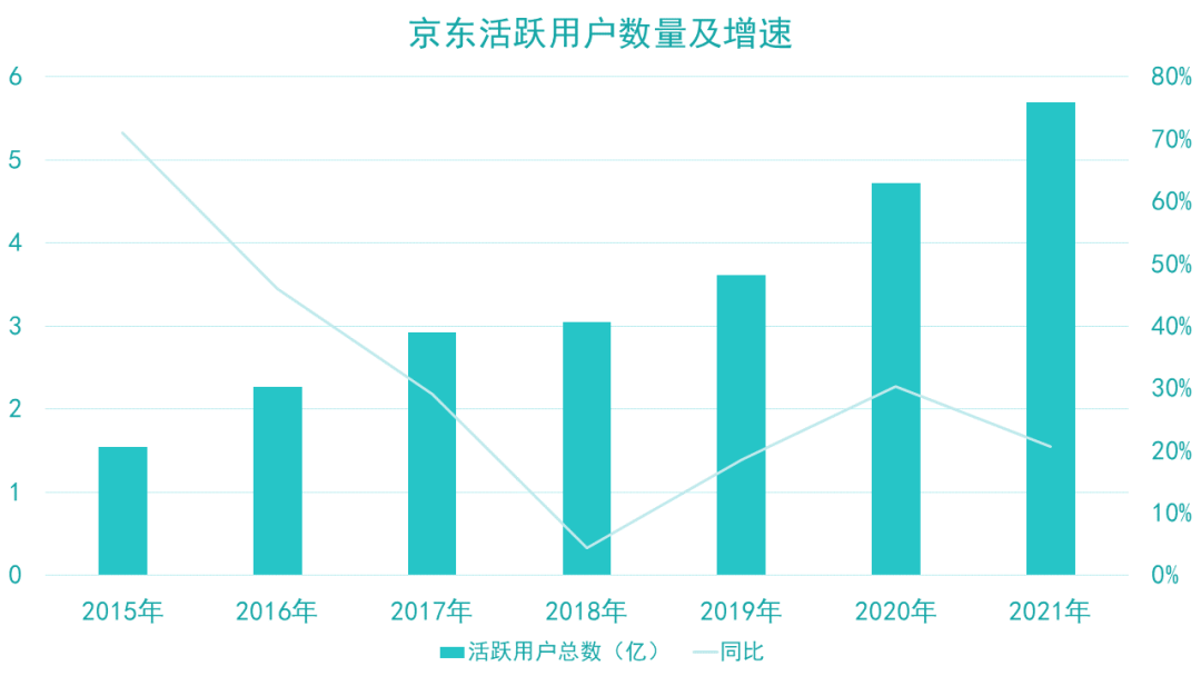 于2019年、2020年及2021年,京東年活躍用戶數(shù)分別達3.620億、4.719億及5.697億。