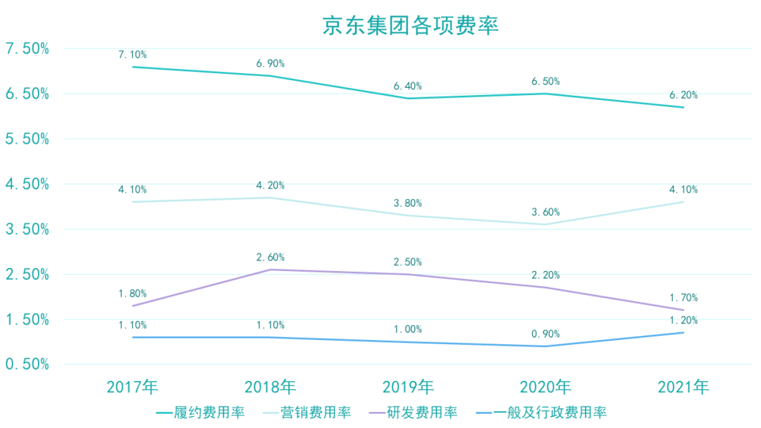 2018年后,隨著收入規(guī)模增長以及前期各項費用投入的成效逐漸顯現(xiàn),履約及研發(fā)等費用率呈現(xiàn)持續(xù)下降態(tài)勢,其中,履約費用率從2018年的6.9%下降到2021年的6.2%,營銷費用率從2018年的2.6%下降到2021年的1.7%。