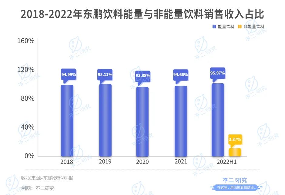 據(jù)東鵬飲料往年財報及2022半年報數(shù)據(jù)顯示,2018-2021年,其能量飲料銷售收入占公司總收入的比例分別為94.99%、95.11%、93.88%和94.66%。而去年上半年其營收占比更是高達95.97%。