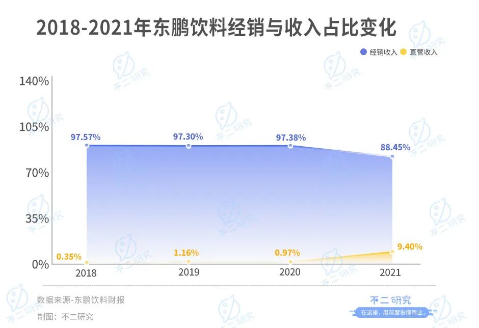 此前,在銷售渠道方面,東鵬飲料過多地依賴經(jīng)銷商模式,而疏于自建渠道。其招股書和2021年報顯示:2018-2021年,公司經(jīng)銷收入的占比分別為97.57%、97.30%、97.38%和88.45%,直營收入占比0.35%、1.16%、0.97%和9.40%。