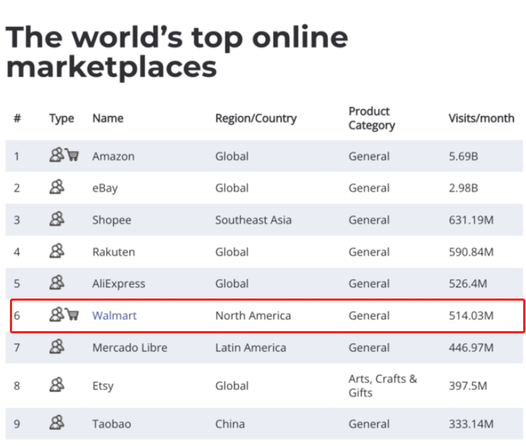 據(jù)2022全球電商平臺(tái)訪問量排行榜顯示,亞馬遜每月訪問量近60億,穩(wěn)居榜首;而沃爾瑪美國站排名第6,市場(chǎng)月訪問量僅5億出頭,流量差距十分明顯。