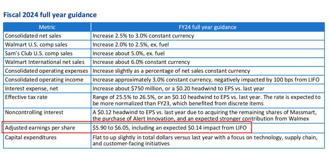 在全年指引中,沃爾瑪對(duì)未來財(cái)年調(diào)整后的每股凈利潤預(yù)估為5.9至6.05美元,而在2023財(cái)年,此數(shù)值為6.25美元。