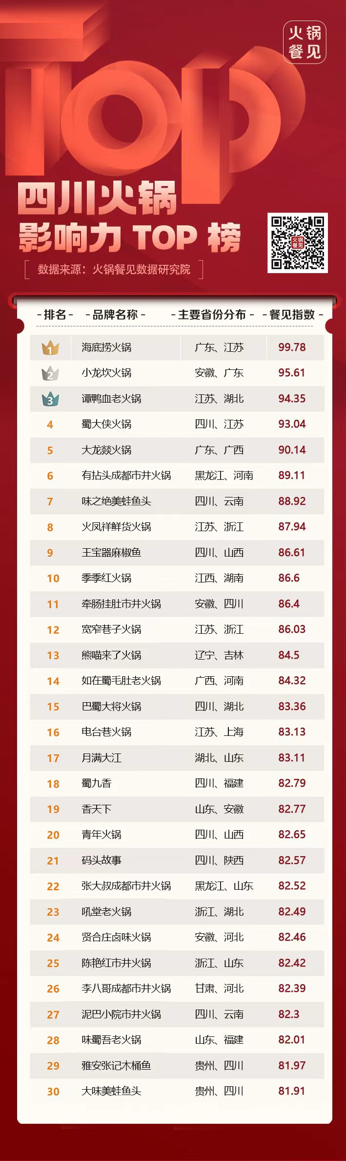 為此,火鍋餐見數(shù)據(jù)研究院,綜合門店數(shù)、傳播、口碑等多方數(shù)據(jù)(截止至2023.2.20),計算出“餐見指數(shù)”,按照分值高低得出“四川火鍋TOP30”。