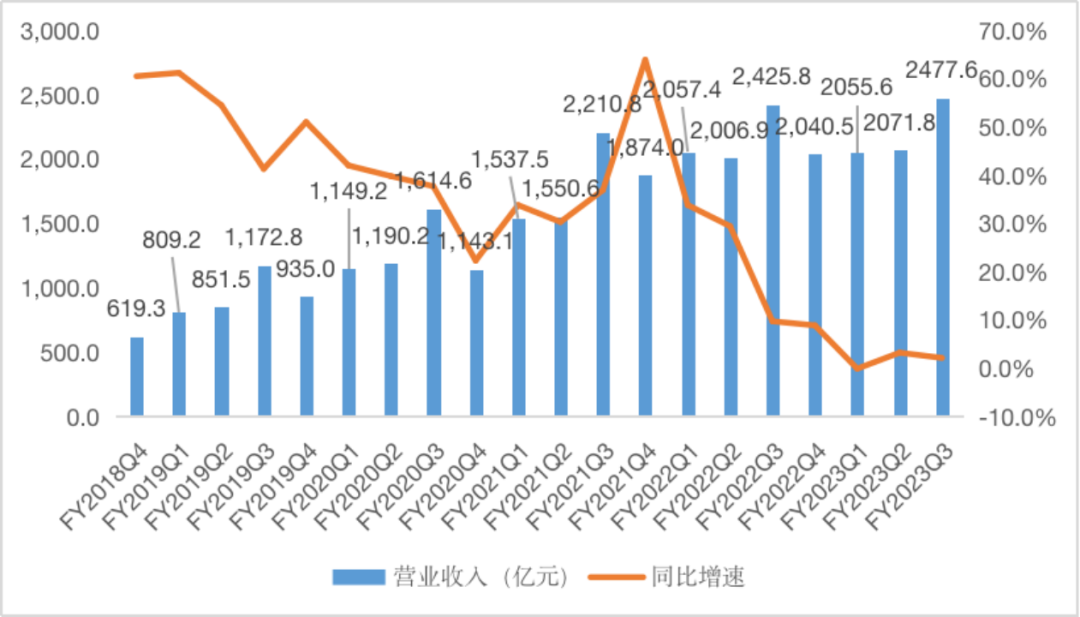 FY23Q3阿里巴巴營業(yè)收入及增速 數(shù)據(jù)來源:wind、36氪整理