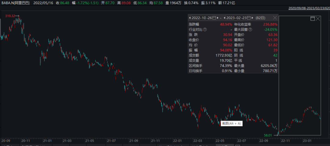從估值上看,經(jīng)過一輪反彈后,阿里的股價(jià)已經(jīng)從自去年10月底的低點(diǎn)反彈了50%,在這種背景下,未來阿里是否仍具備反彈空間是市場最為關(guān)注的問題。
