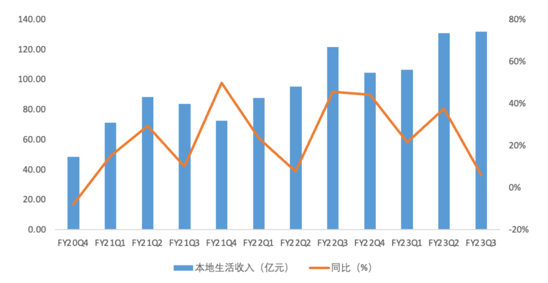 FY23Q3阿里巴巴本地生活業(yè)務(wù)收入及同比 資料來源:公司財(cái)報(bào),36氪整理