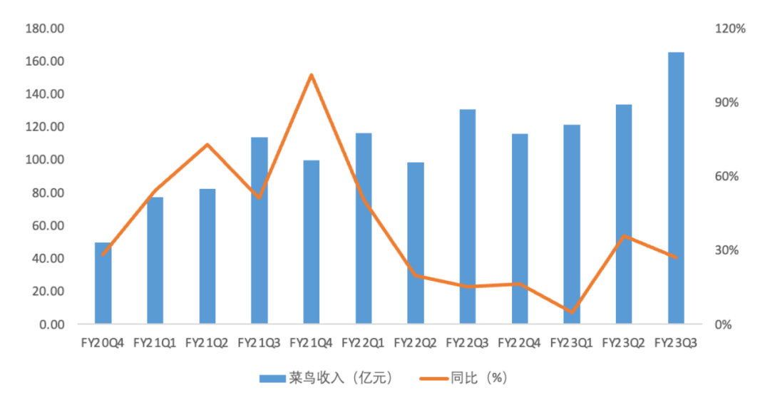 FY23Q3阿里巴巴菜鳥業(yè)務(wù)收入及同比 資料來源:公司財(cái)報(bào),36氪整理