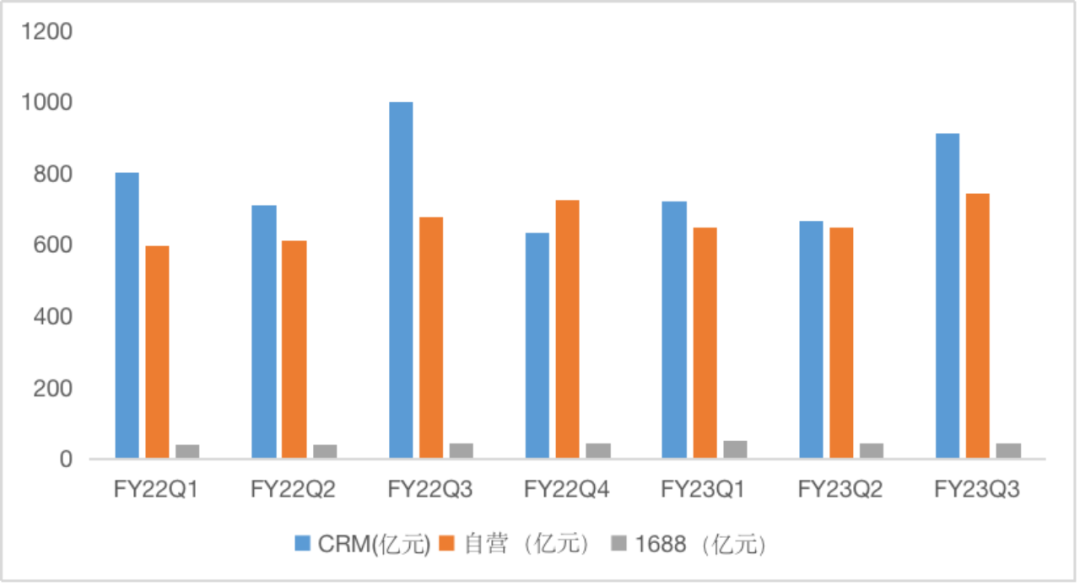 FY23Q3,中國商業(yè)分部收入為1699.9億元,同比下滑1%。其中,CRM收入跌破千億元降至913.4億元,同比下滑9%;自營業(yè)務(wù)(盒馬、阿里健康、高鑫零售、銀泰、天貓超市、天貓自營)收入744.2億元,同比增長10%;批發(fā)業(yè)務(wù)(1688)收入42.2億元,同比基本持平。