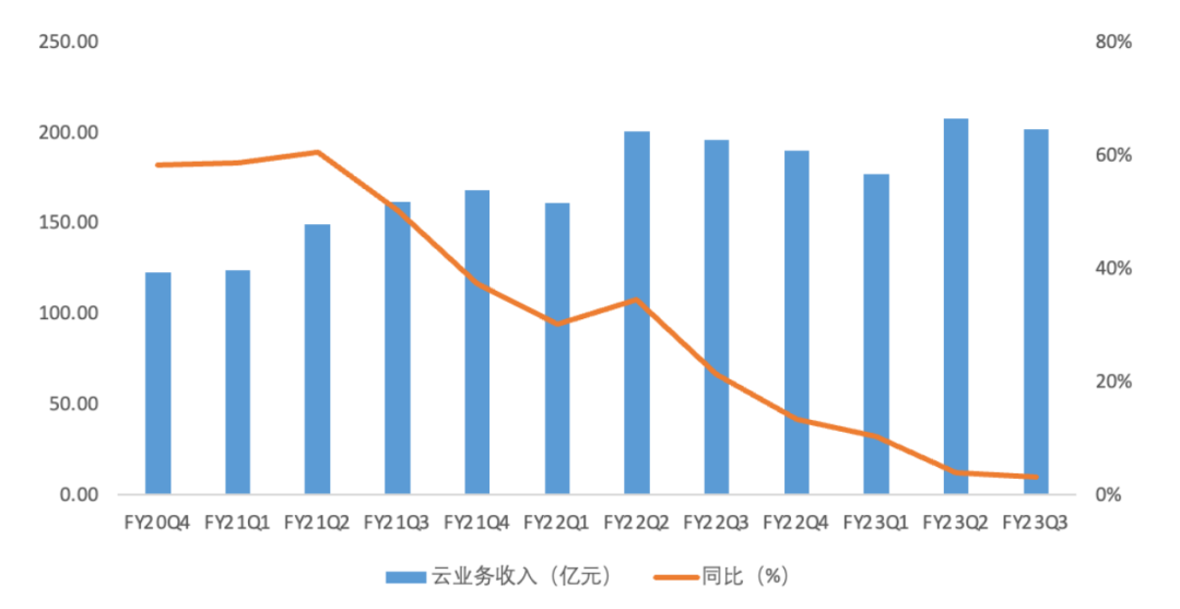 FY23Q3阿里巴巴云業(yè)務(wù)收入及同比 資料來源:公司財(cái)報(bào),36氪整理