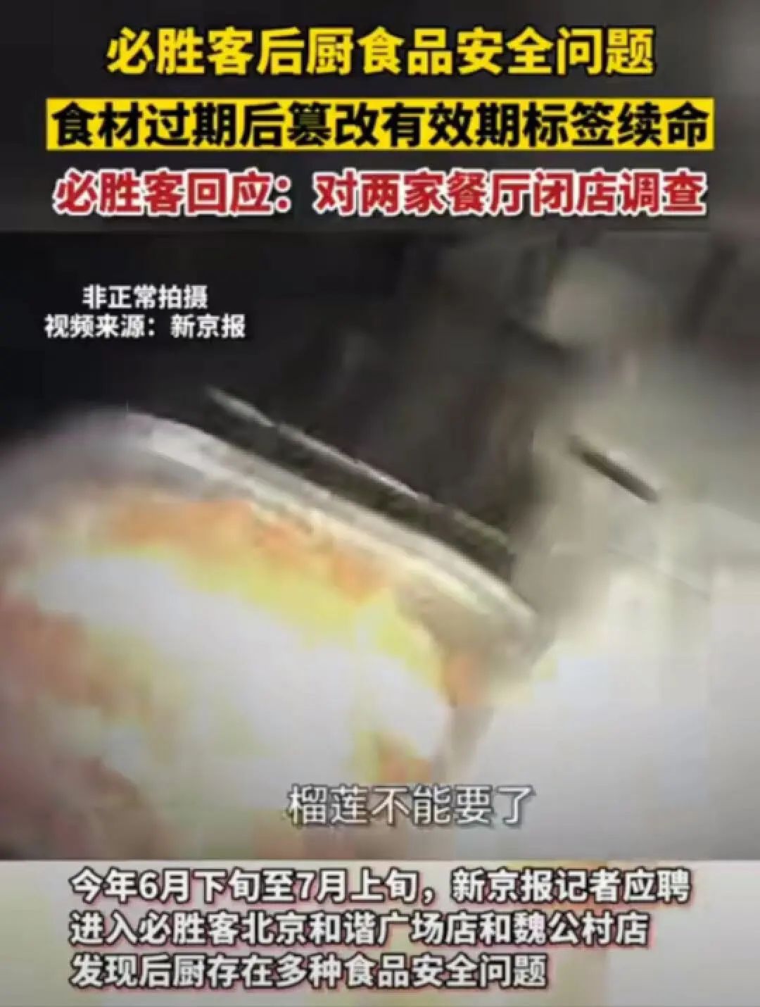 去年7月,必勝客北京兩家門店被曝光食安問題,將過期食材篡改有效期標簽后續(xù)命,門店負責人則“睜一只眼閉一只眼”。事情發(fā)酵后,一度在微博引起熱議,有關部門立刻下場,兩家門店閉店檢查,被罰款10萬元。