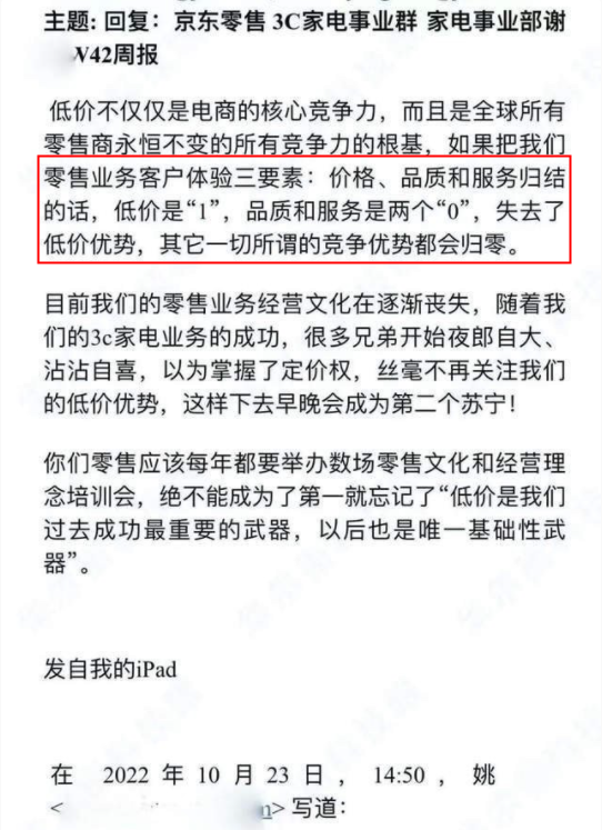 在劉強東的觀念中,零售業(yè)務的用戶體驗主要有價值、品質(zhì)、服務三個要素。低價是“1”,品質(zhì)和服務是兩個“0”。目前,京東的品質(zhì)和服務都有優(yōu)勢,但沒有低價一切都是空談。