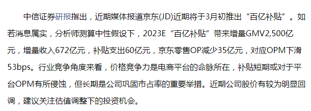 同時,有研究機構(gòu)指出,預計百億補貼對京東利潤的影響可控。行業(yè)分析師認為補貼短期或?qū)τ谄脚_OPM有所侵蝕,但長期是公司鞏固市占率的重要舉措。