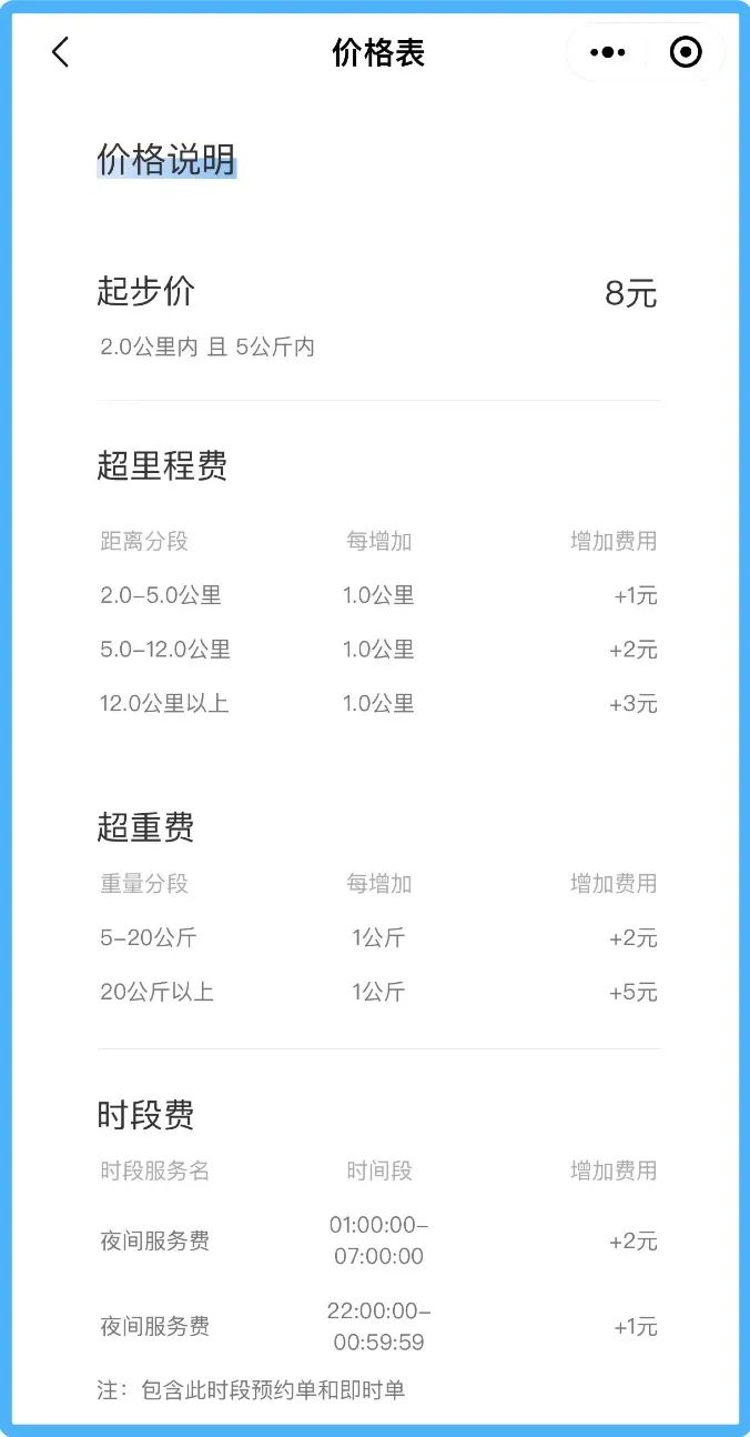 秦天使用閃送服務(wù)的配送費(fèi)價目表