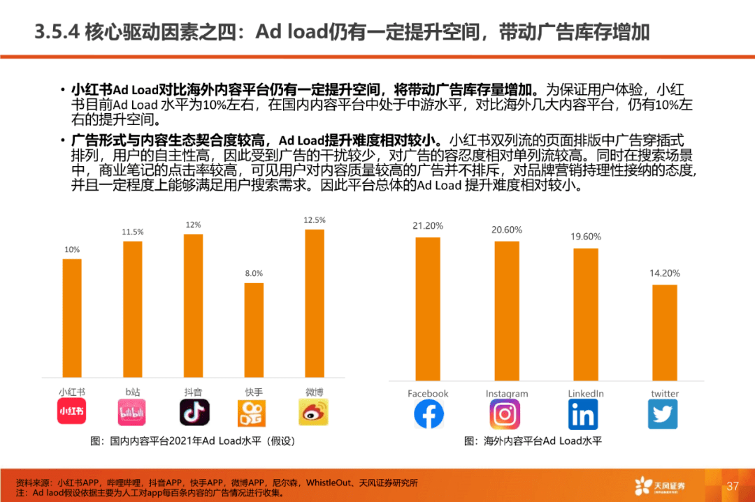 在廣告加載率(Ad Load)上,根據(jù)天風(fēng)證券的研究,小紅書目前Ad Load水平在10%左右,在國(guó)內(nèi)內(nèi)容平臺(tái)中處于中游水平,仍有10%左右的提升空間。但考慮到用戶體驗(yàn),小紅書此前一直對(duì)嚴(yán)控Ad load水平,避免社區(qū)生態(tài)受廣告干擾,這一點(diǎn)上,小紅書與微信都十分謹(jǐn)慎。