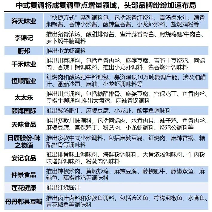 除了新銳品牌風(fēng)生水起外,老牌企業(yè)也順勢(shì)而為,尋求第二增長(zhǎng)曲線。海天、李錦記、廚邦等調(diào)味品企業(yè)加大在復(fù)合調(diào)味品方面的投入。