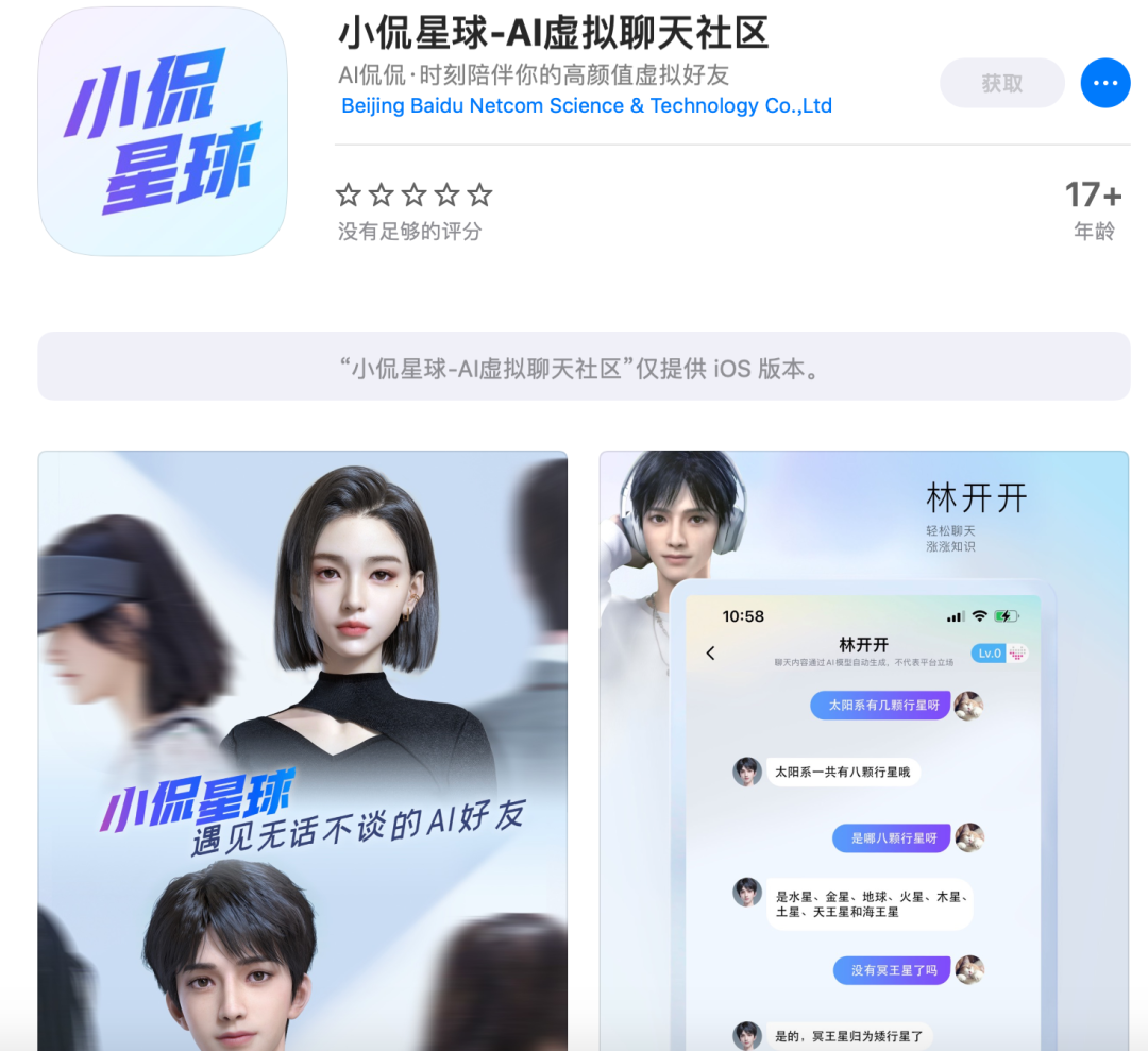 Tech星球還獨(dú)家獲悉,在推出文心一言前,百度已經(jīng)于近日推出了一款名為AI虛擬聊天社區(qū)APP“小侃星球”,用戶可以和虛擬人進(jìn)行簡(jiǎn)單的聊天,雖然達(dá)不到深度的AI聊天,但具備了AI在社交場(chǎng)景的應(yīng)用。
