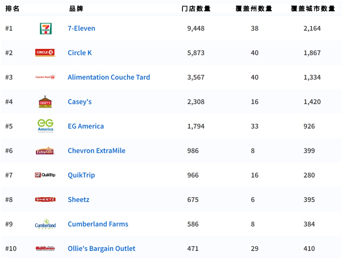 2022年,美國TOP10便利店名單。圖源:ScrapeHero