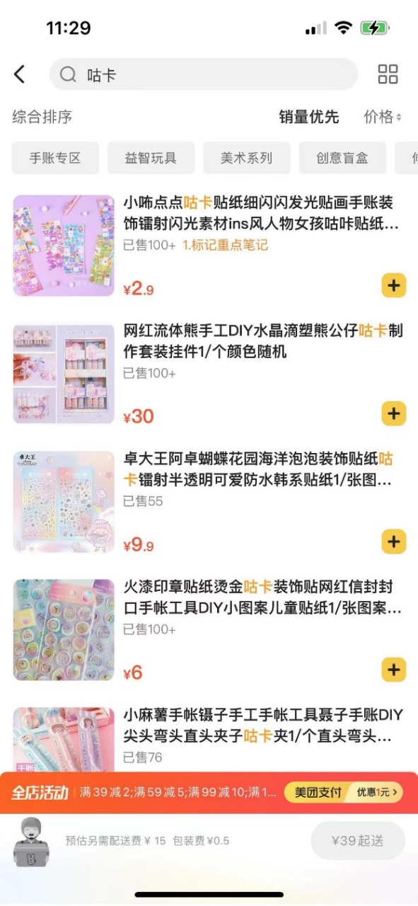 “女兒說(shuō)想做奶油咕卡,但小區(qū)門口的文具店只有最簡(jiǎn)單的貼紙咕卡。后來(lái)我就在外賣上找到了一家賣咕卡的店,花樣特多,我就下了一單。”劉女士說(shuō),“當(dāng)晚我就和女兒一起做了幾個(gè)咕卡,小朋友很有成就感!