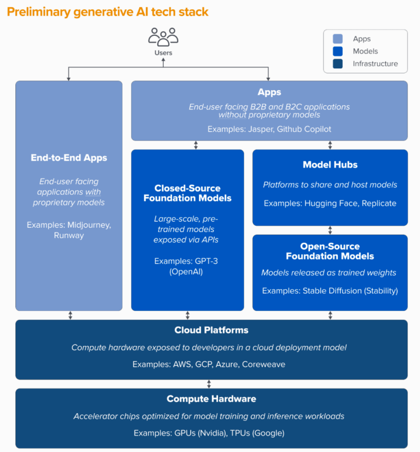 圖:生成式AI技術棧圖示,來源:a16z《 Who Owns the Generative AI Platform?》