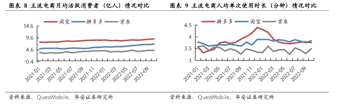 3、在電商行業(yè)內(nèi)部仍保持高強度競爭的態(tài)勢下,檢驗競爭者能力質(zhì)量的重要參數(shù)除了用戶數(shù)量,還有用戶粘性。根據(jù)QM和華安證券的數(shù)據(jù),淘寶月活用戶在高于同業(yè)競爭對手同時,單次使用時長已在12月實現(xiàn)下行趨勢的逆轉(zhuǎn),重回行業(yè)領先。同時,至2022年末,淘系電商的用戶粘性仍保持較大幅度的領先身位。