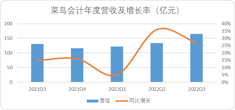 圖:菜鳥會計年度營收及增長率,來源:Choice金融客戶端