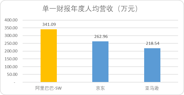 費用水平與人均營收水平的演變是透視組織創(chuàng)新的財務窗口。從中我們可以看到,經(jīng)歷了過去三年快速應變,阿里的整體費用率水平下降很明顯。自2020年費用率巔峰來看,整體費率下降了11.69pct。人均效用層面,投入產(chǎn)出比明顯優(yōu)化,阿里巴巴的單一財報年度人均營收為341.09萬,高于行業(yè)平均水平。