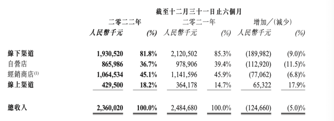 分渠道看,報告期內(nèi)線上渠道的總收入為4.30億元,較上年同期增長了17.9%。線上渠道的銷售收入占比也從2022上半財年的14.7%增加到2023上半財年的18.2%。