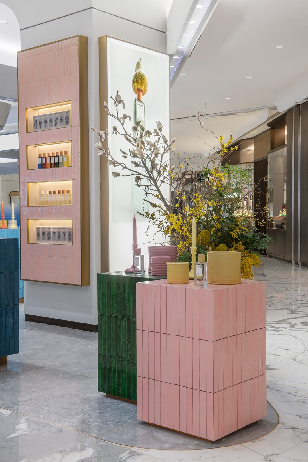 首店坐落于商場一樓中庭位置,整體色調以藍色為主,以綠色和粉色為點綴,據(jù)悉這三種顏色的釉面瓷磚均是源自西班牙手工精制的,整個門店空間生動又鮮活,非常富有春日氣息。