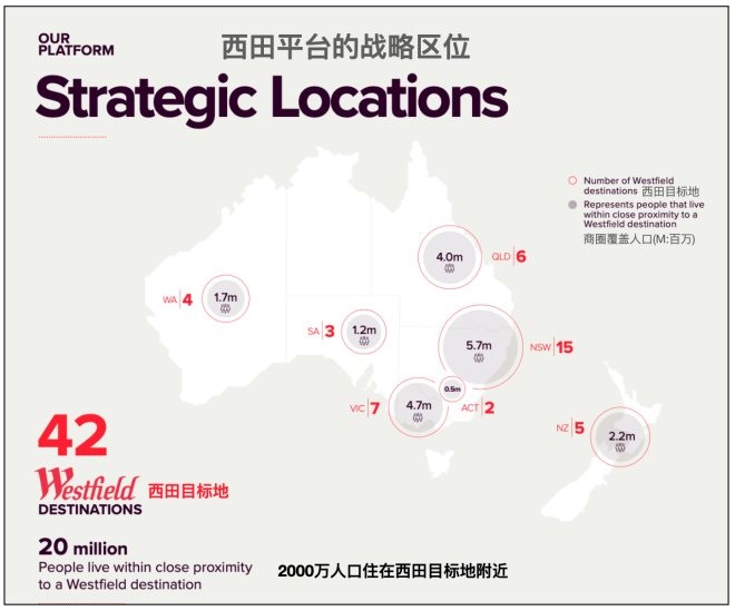 簡報在開始概述SCG集團在澳大利亞和新西蘭的購物中心時,首先提到的是商業(yè)地產(chǎn)企業(yè)最關(guān)注的資產(chǎn)價值問題。西田全部42家稱之為“西田生活廣場”的購物中心總資產(chǎn)為512億澳元,其中SCG投資350億澳元,第三方基金162億澳元。SCG集團擁有這些資產(chǎn)的永久管理權(quán)。報告標注了每一個西田生活廣場所在的位置和覆蓋的商圈人口(以開車30分鐘距離為限)。這樣你就可以清楚地從圖1看到西田在澳大利亞和新西蘭的購物中心覆蓋了這兩個國家大約2000萬的人口。