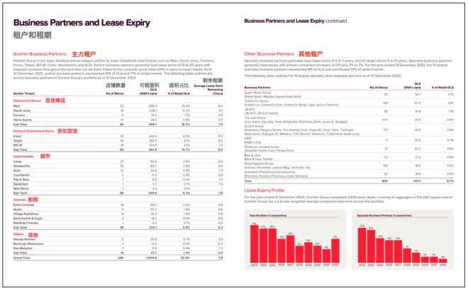 在簡述了資產(chǎn)價值、消費者情況之后就是西田租戶的情況介紹。西田稱之為商業(yè)合作伙伴。分為主力租戶和其他合作商家。像百貨商場(Myer、David Johnes)、平價百貨(Kmart、Target、BIG W)和超市(Coles、Woolworths、ALDI)等都是西田的主力租戶,也是西田不可或缺的長年和固定的合作伙伴。這些主力租戶的租期通常為15至25年,在整個租期內(nèi),租金的遞增與消費者價格指數(shù)(CPI)掛鉤或基于銷售額的比例約定。截至2022年12月31日,主力租戶占總可租面積(GLA)的51%和租金總收入的17%。見圖2 。