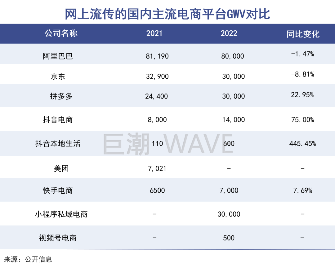 根據(jù)分析師和相關(guān)公司內(nèi)部流出的測(cè)算數(shù)據(jù)顯示,拼多多2022年GMV預(yù)計(jì)達(dá)到3萬(wàn)億元或者更高,這一數(shù)字已和京東旗鼓相當(dāng),而抖音電商加本地生活GMV也接近1.5萬(wàn)億元。