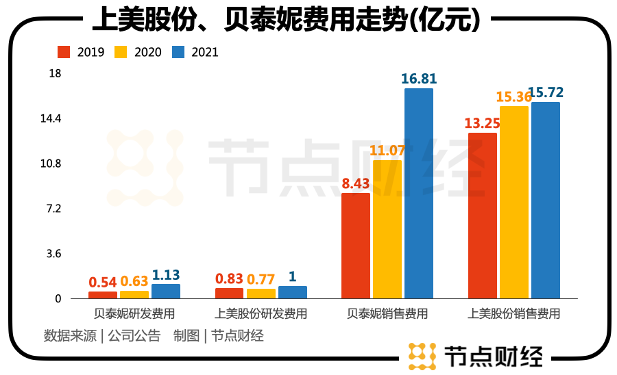 WINONA Baby母公司貝泰妮也存在相似的問題,在2019-2021年期間,其研發(fā)費(fèi)用雖然有所增長(zhǎng),但最高只有1.13億元(2021年),同期的銷售費(fèi)用規(guī)模達(dá)到了16.81億元。