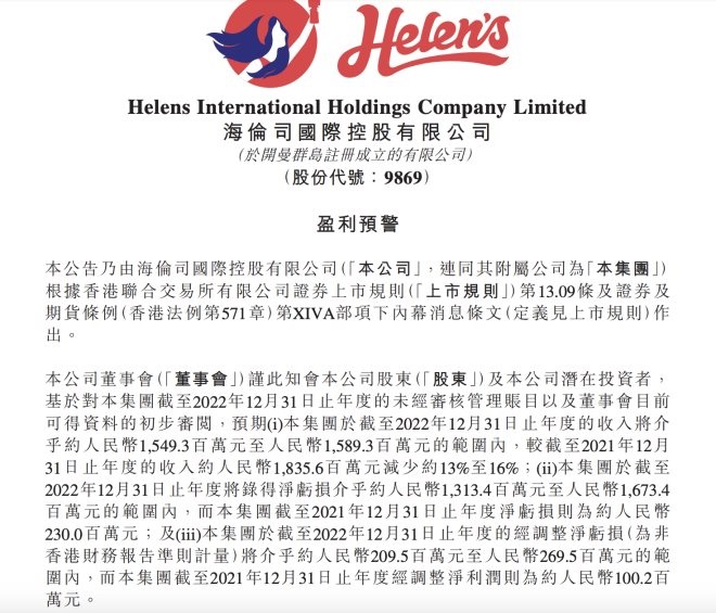 公告稱,海倫司預(yù)期2022年?duì)I收介乎15.49億元-15.89億元之間,同比下降約13%-16%;實(shí)現(xiàn)凈虧損介乎13.13億元-16.73億元之間,2021年同期凈虧損為2.3億元;經(jīng)調(diào)整凈虧損(為非香港財(cái)務(wù)報(bào)告準(zhǔn)則計(jì)量)將介乎約2.09億元-2.70億元的范圍內(nèi),2021年度經(jīng)調(diào)整凈利潤(rùn)則為1億元。