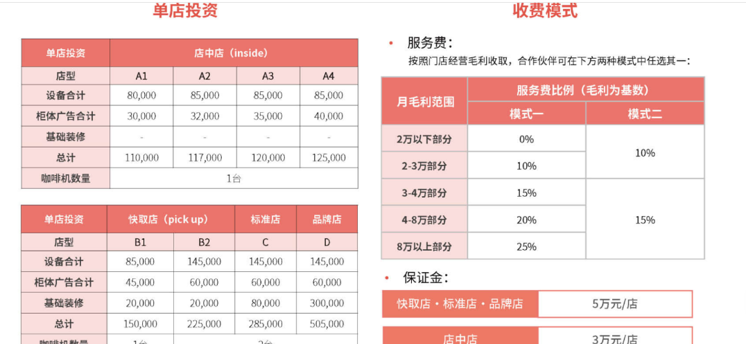 值得一提的是,咖啡夢想家計劃中的一項重要區(qū)別在于品牌方收取的服務(wù)費。在聯(lián)營合作中,庫迪咖啡會根據(jù)聯(lián)營商的門店經(jīng)營毛利收取不同模式、不同比例的服務(wù)費。模式一:2萬元以下部分不收取服務(wù)費、2-3萬元部分收取10%的服務(wù)費、3-4萬元部分收取15%、4-8萬元部分收取20%、8萬元以上部分收取25%;模式二:3萬元以內(nèi)收取10%的服務(wù)費、3萬元以上的部分收取15%的服務(wù)費。