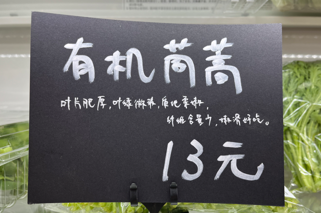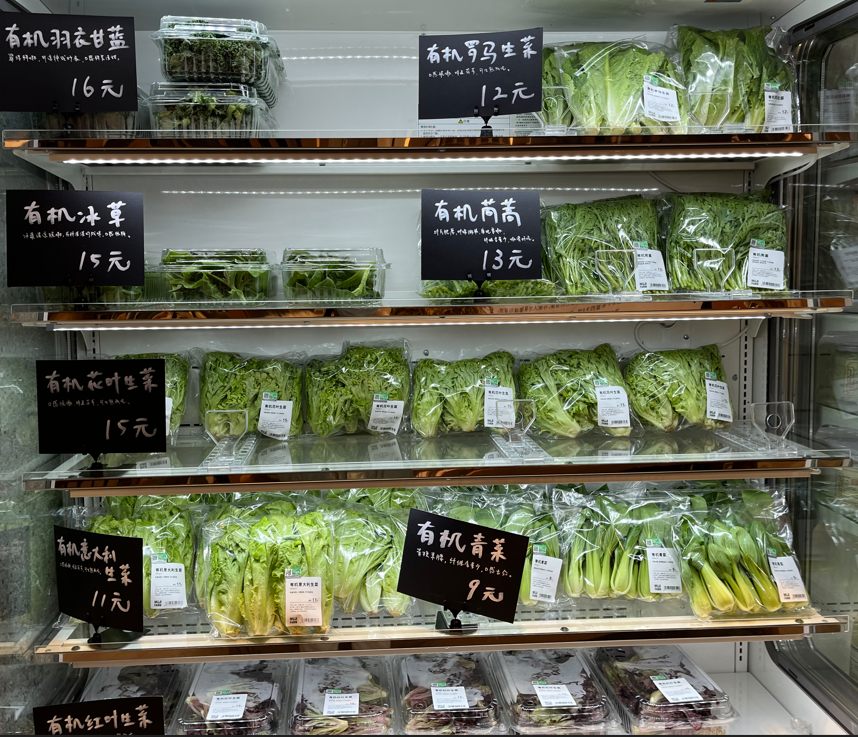 菜品以生菜、甘藍(lán)、冰草等方便進(jìn)行沙拉等輕食餐點(diǎn)制作的進(jìn)口品種有機(jī)時(shí)蔬為主,如有機(jī)羅馬生菜、有機(jī)意大利生菜、有機(jī)紅葉生菜、有機(jī)紫甘藍(lán)、有機(jī)胡蘿卜等。價(jià)格相對(duì)日常超市偏高,如400g的皺葉甘藍(lán)18元,250g的紅葉時(shí)蔬18元。