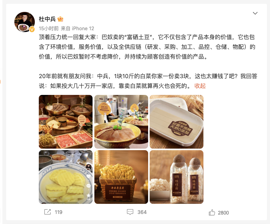隨后,創(chuàng)始人杜中兵的一篇微博再次被將巴奴火鍋推上了風(fēng)口浪尖。在微博上,杜中兵稱巴奴賣土豆不是普通土豆,是巴奴火鍋與土豆博士劉杰合作的富硒土豆,富含微量元素。所以“巴奴暫時(shí)不考慮降價(jià)。”